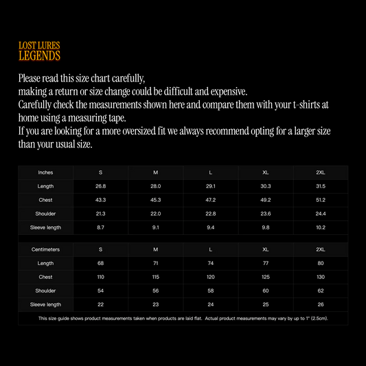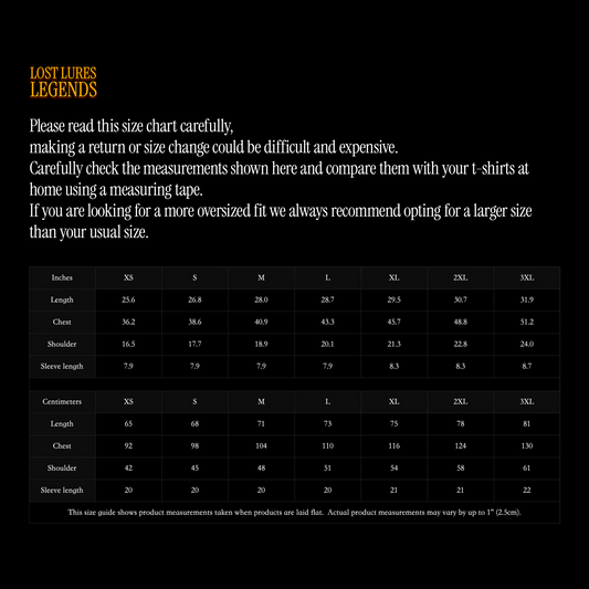 If you want to return your order because you got the wrong size or color you can do so within 14 days of the arrival of the package but you will have to take care of the international return shipping (the price may vary depending on the country), you will also be refunded with a voucher for the same amount spent (product and first shipment) which can only be used on the Lost Lures Legends website. Contact me at lostlureslegends@gmail.com